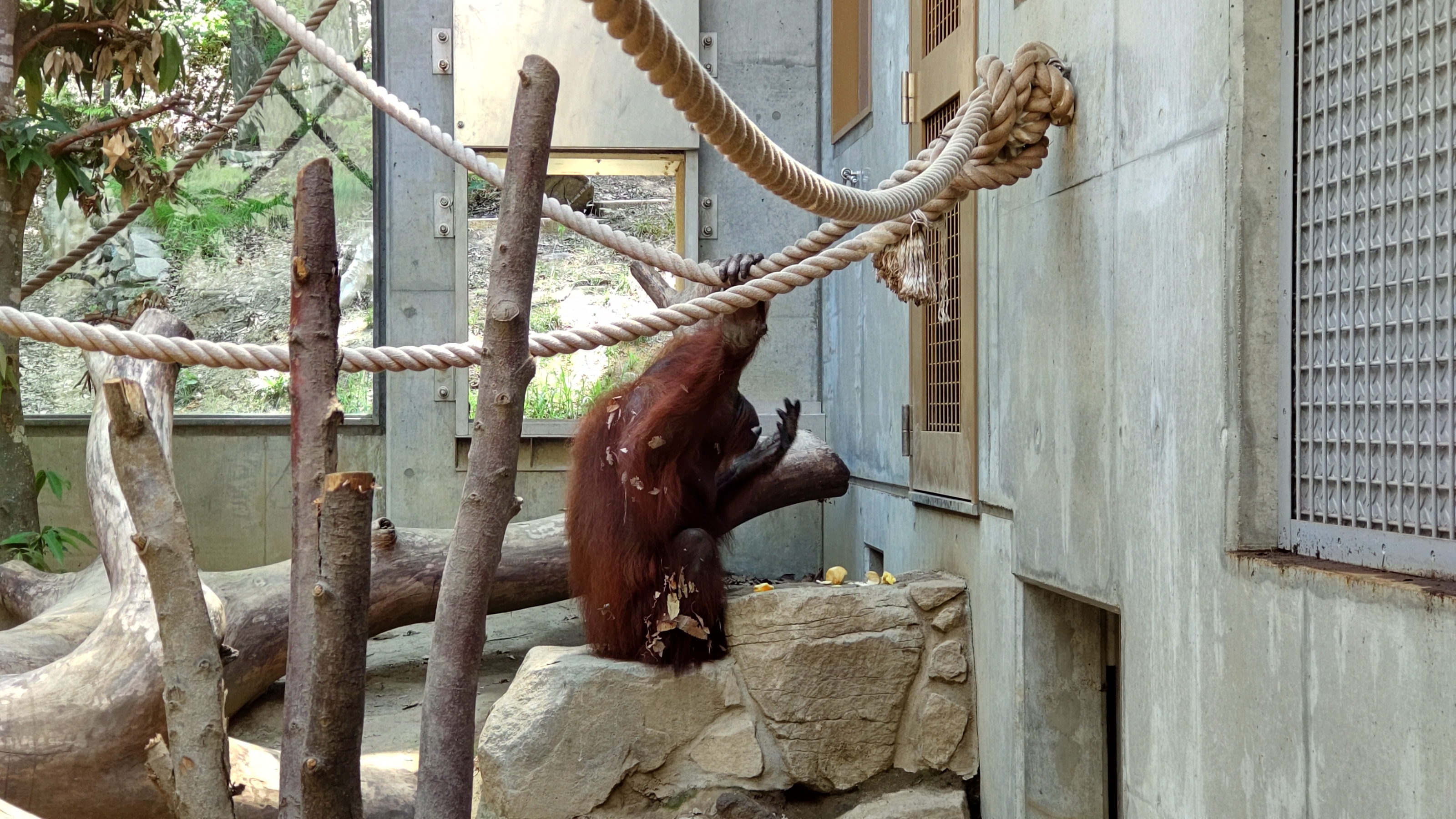 オラウータンの食事です。飼育員さんから網越しに手渡しです。バナナやミカンは、皮をむいて食べました。「もっと」と手で合図していました。